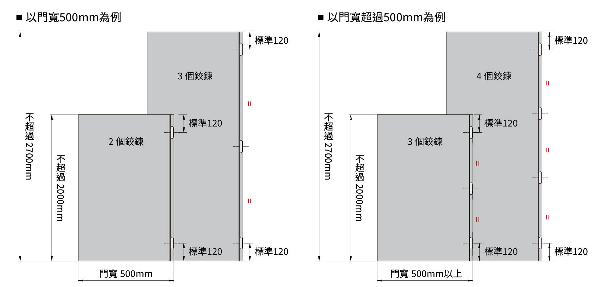 ■ 單顆承重10kg,門高2700mm僅需使用3顆鉸鍊