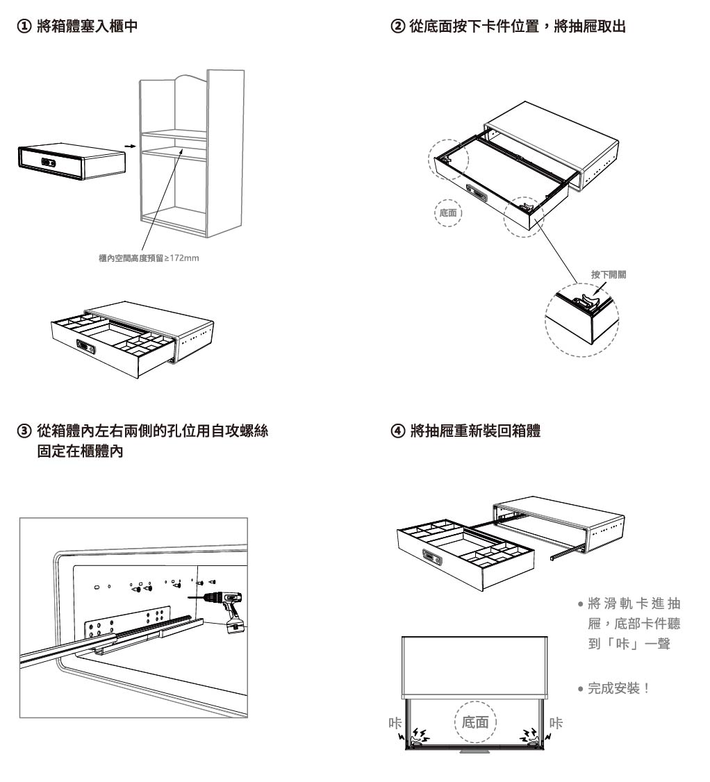 ■ 產品包含:指紋鎖抽屜、分隔盒、鑰匙、Type C充電線