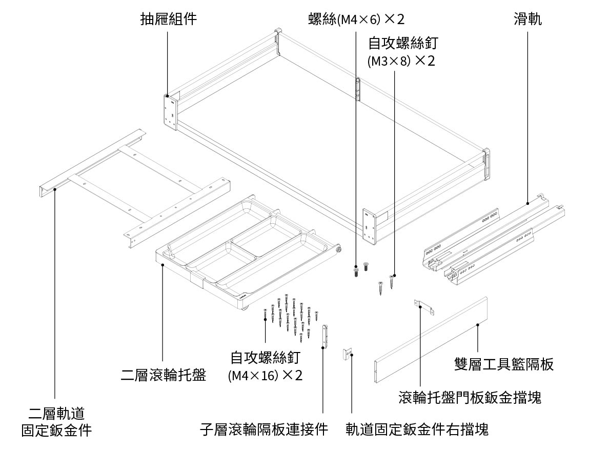 ■ 五金內容物:標配子抽套組(包含滾輪托盤)